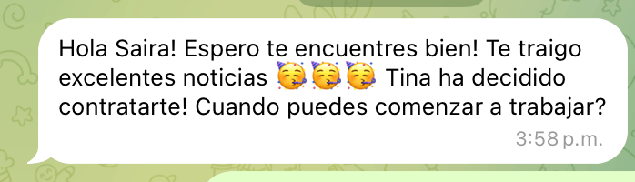 En nuestra sesión de cierre, Mimi nos contó que consiguió su primer trabajo remoto 🥳. Lo hizo en menos de 3 meses.
