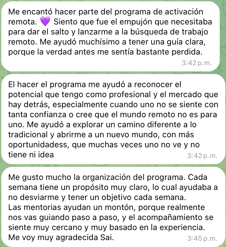 Ahora estoy mucho más aterrizada, clara y segura, sabiendo que el perfil profesional que he construido se adapta perfecto también al mundo remoto y con mejores condiciones, que tiene valor y que no necesariamente debo empezar en un cargo como principiante como antes pensaba.